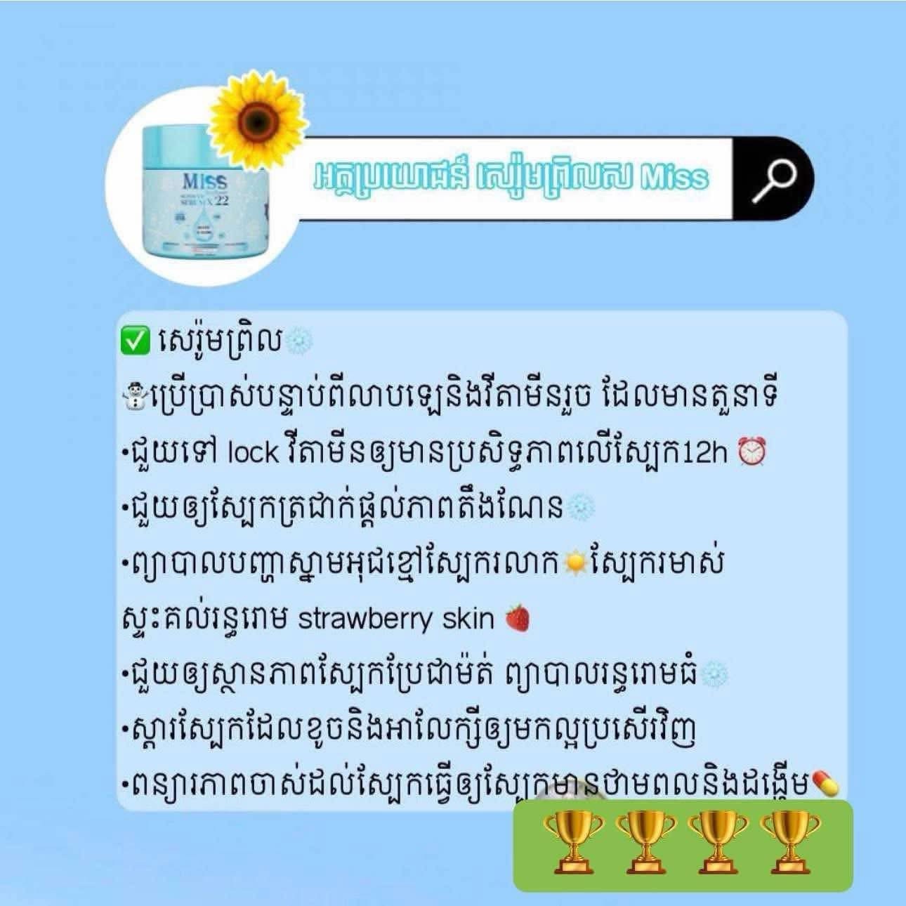• ប្រើប្រាស់បន្ទាប់ពីលាបឡេនិងវីតាមីនរួច មានតួនាទីជួយទៅ lock វីតាមីនឲ្យកាន់តែមានប្រសិទ្ធភាពលើស្បែក 12h