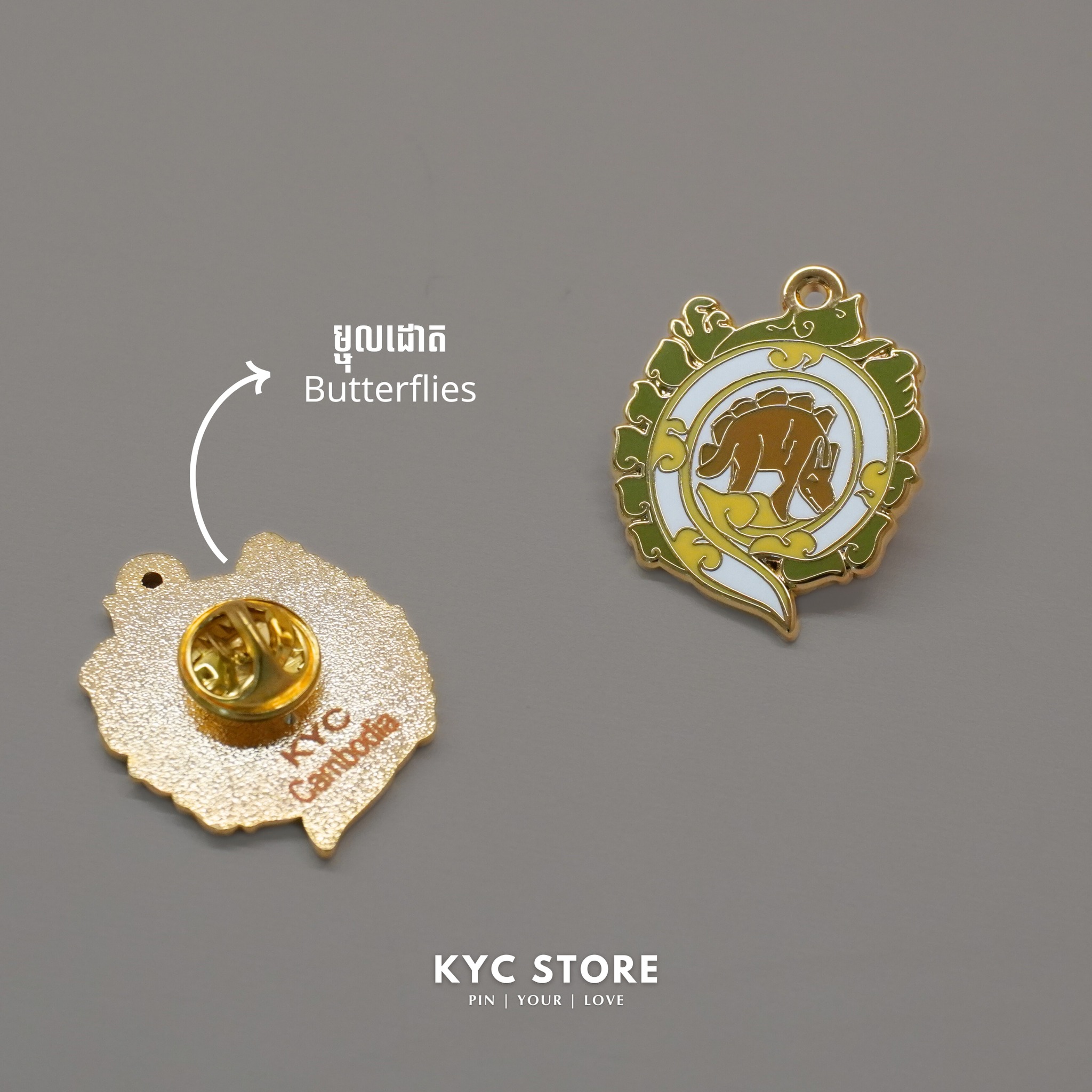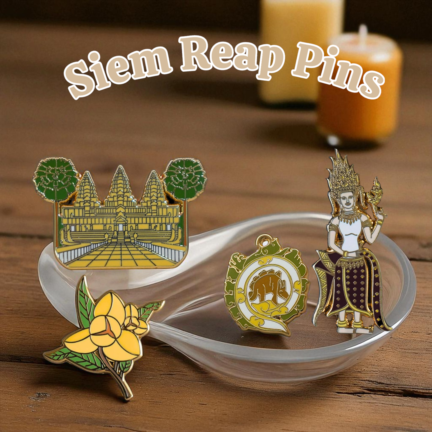 Siem Reap Pins Collection featuring iconic Cambodian designs – Angkor Wat temple, Apsara dancer, frangipani flower, and elephant emblem. Perfect souvenirs, gifts, or collectibles for Khmer culture lovers.